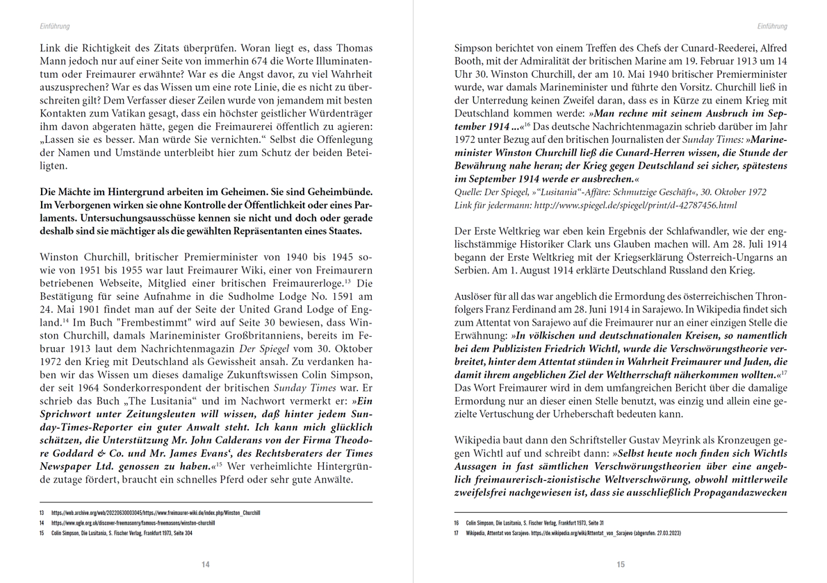 Winston Churchill, britischer Premierminister von 1940 bis 1945 sowie von 1951 bis 1955 war laut Freimaurer Wiki, einer von Freimaurern betriebenen Webseite, Mitglied einer britischen Freimaurerloge.[3] Die Bestätigung für seine Aufnahme in die Sudholme Lodge No. 1591 am 24. Mai 1901 findet man auf der Seite der United Grand Lodge of England.[4] Im Buch "Frembestimmt" wird auf Seite 30 bewiesen, dass Winston Churchill, damals Marineminister Großbritanniens, bereits im Februar 1913 laut dem Nachrichtenmagazin Der Spiegel vom 30. Oktober 1972 den Krieg mit Deutschland als Gewissheit ansah. Zu verdanken haben wir das Wissen um dieses damalige Zukunftswissen Colin Simpson, der seit 1964 Sonderkorrespondent der britischen Sunday Times war. Er schrieb das Buch „The Lusitania“ und im Nachwort vermerkt er: »Ein Sprichwort unter Zeitungsleuten will wissen, daß hinter jedem Sunday-Times-Reporter ein guter Anwalt steht. Ich kann mich glücklich schätzen, die Unterstützung Mr. John Calderans von der Firma Theodore Goddard & Co. und Mr. James Evans‘, des Rechtsberaters der Times Newspaper Ltd. genossen zu haben.«[5] Wer verheimlichte Hintergründe zutage fördert, braucht ein schnelles Pferd oder sehr gute Anwälte.