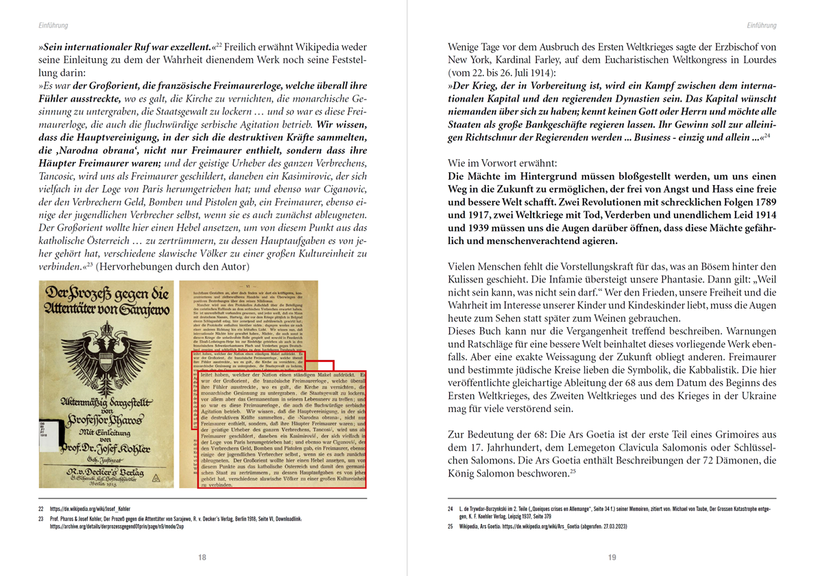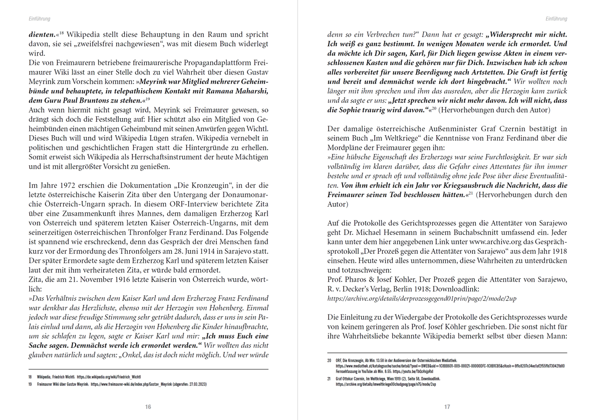 Auf die Protokolle des Gerichtsprozesses gegen die Attentäter von Sarajewo geht Dr. Michael Hesemann in seinem Buchabschnitt umfassend ein. Jeder kann unter dem hier angegebenen Link unter www.archive.org das Gesprächsprotokoll „Der Prozeß gegen die Attentäter von Sarajewo“ aus dem Jahr 1918 einsehen. Heute wird alles unternommen, diese Wahrheiten zu unterdrücken und totzuschweigen: